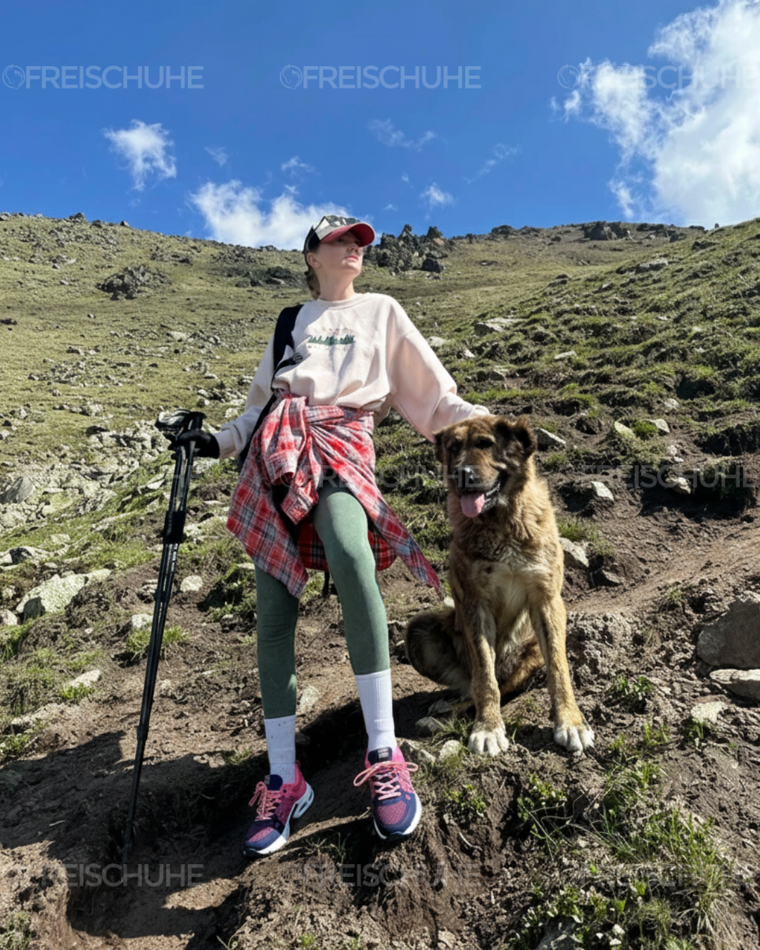 "Beim Picknick mit meinem Hund genieße ich jeden Schritt. Der Stretch sitzt perfekt, nichts drückt, die Sohlen federn sanft ab, meine Knie fühlen sich leicht und frei."