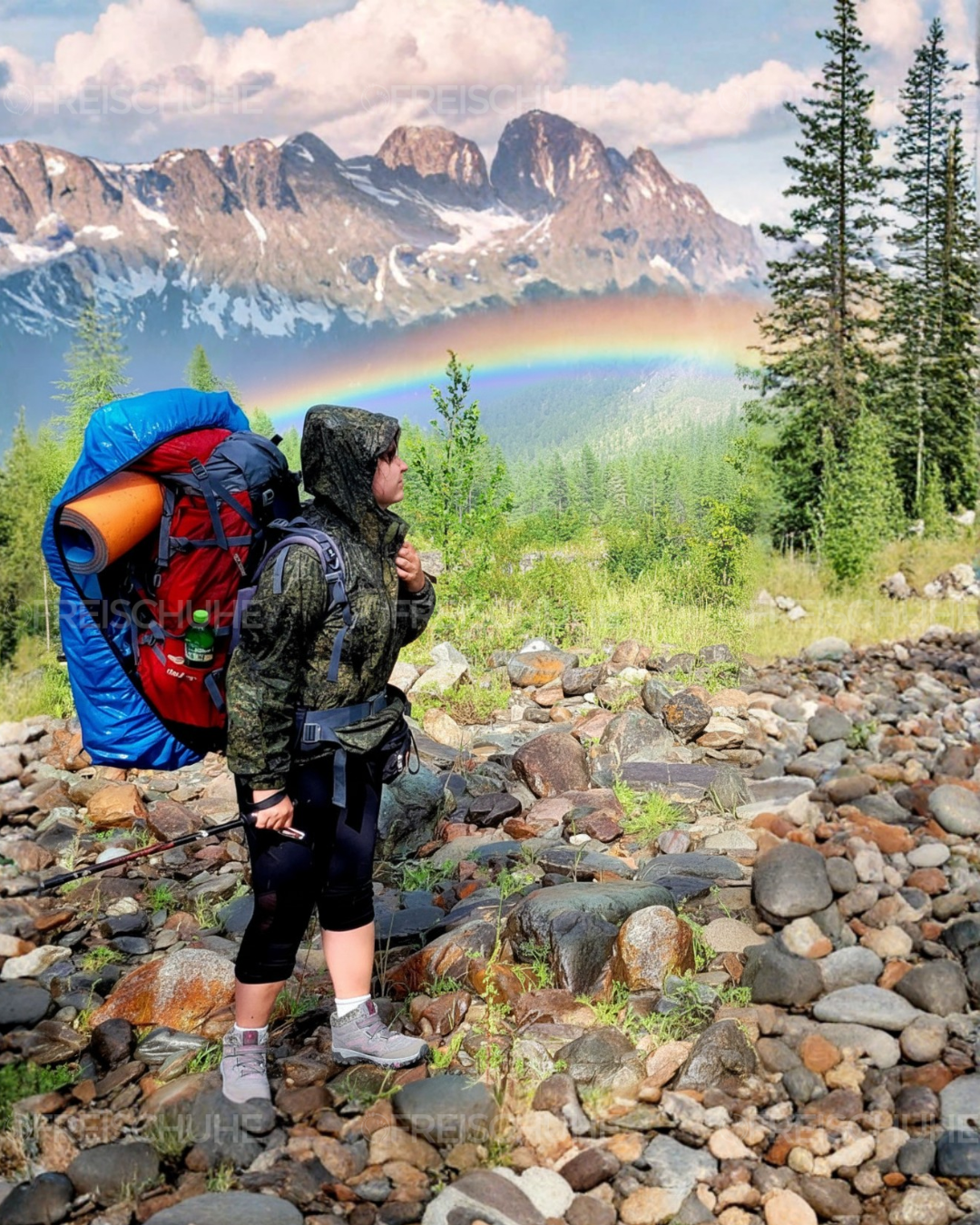 „Beim Alpen-Hike gab mir der Schuh sicheren Halt. Nach dem Regen erlebte ich den schönsten Moment: ein Foto mit Regenbogen ohne Schmerzen, dank perfektem Grip.“